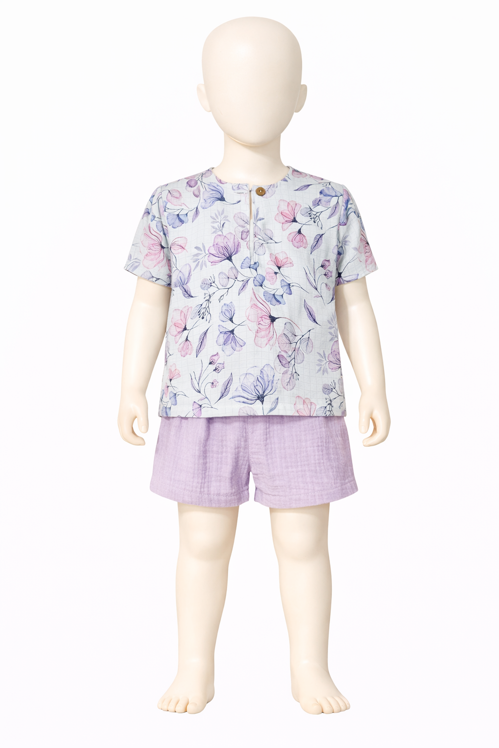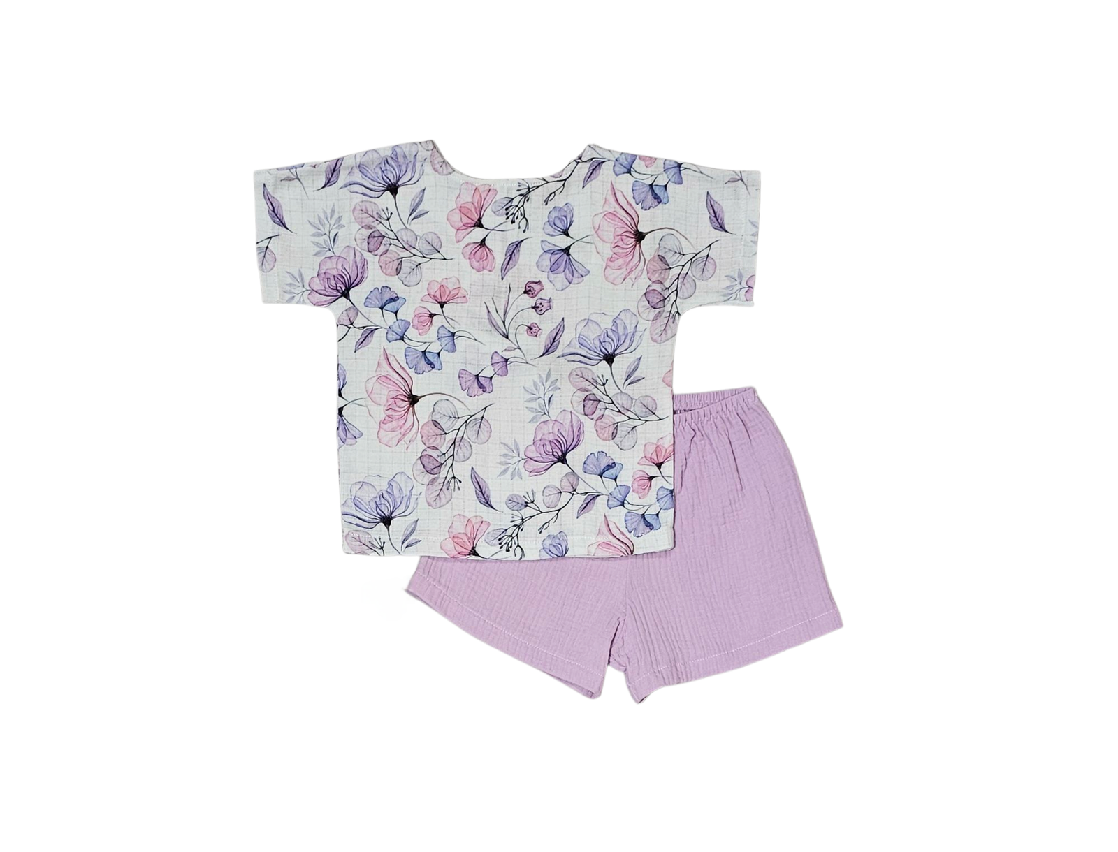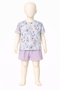 Lengvumas, kurį pajusi vos palietus – šis iš dviejų spalvų ( margos ir šviesios alyvos )  suderintas komplektukas pasiūtas iš 100% garintos medvilnės muslino. Tai – paprasto, laisvo kirpimo rūbeliai, kurie nevaržo judesių ir leidžia odai kvėpuoti net ir pačiomis karščiausiomis vasaros dienomis.