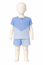 Lengvumas, kurį pajusi vos palietus – šis iš dviejų spalvų ( šviesiai žydros ir žydros ) suderintas komplektukas pasiūtas iš 100% garintos medvilnės muslino. Tai – paprasto, laisvo kirpimo rūbeliai, kurie nevaržo judesių ir leidžia odai kvėpuoti net ir pačiomis karščiausiomis vasaros dienomis.