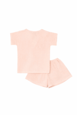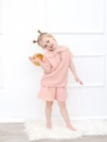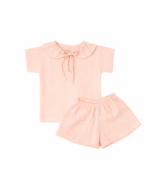 Šis dvigubo medvilninio muslino komplektukas ( šviesaus persiko spalvos ) – tai švelnumas, kurį norisi vilkėti visą dieną. Lengvai krentanti palaidinė su trumpomis rankovėmis ir romantiška apykakle, puošta raišteliais, dera su patogiais šortukais. Minkšta, kvėpuojanti medžiaga švelniai priglunda prie odos ir nevaržo judesių – puikus pasirinkimas tiek mažoms išdykėlėms, tiek jautresnės odos vaikams.