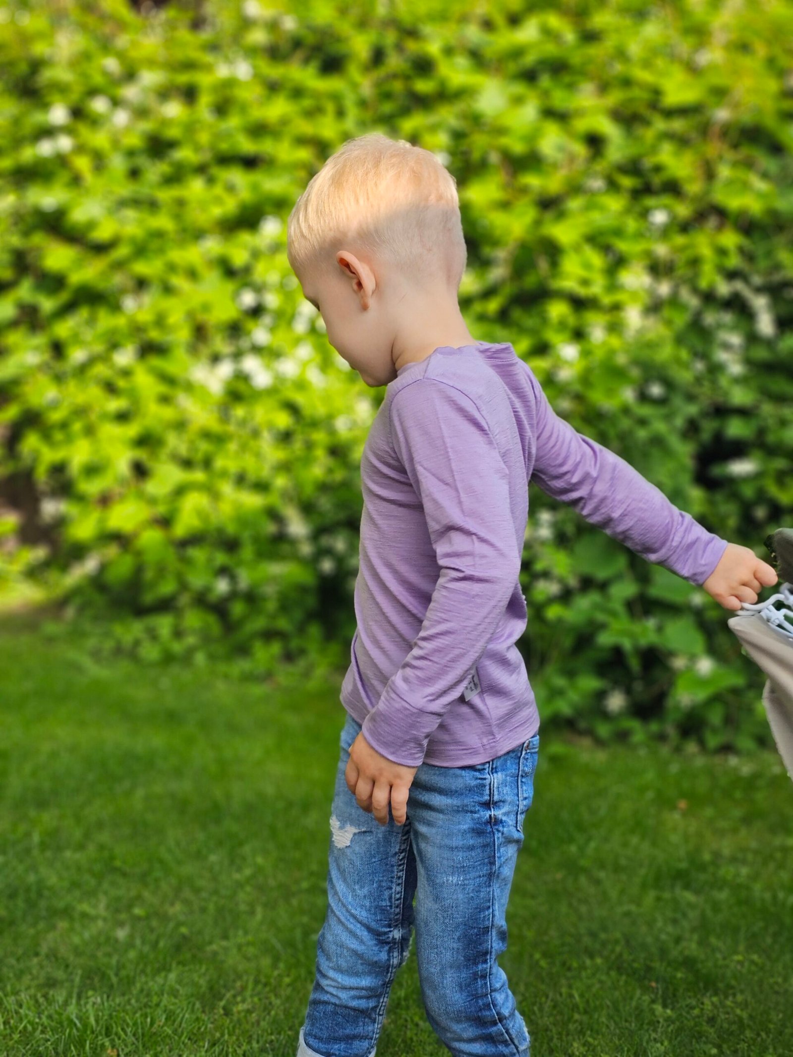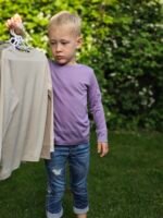 Alyvinės spalvos. Ilgomis rankovėmis, kad būtų šilta, bet lengva – puikiai tinka visiems metų laikams.
