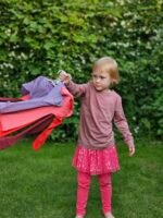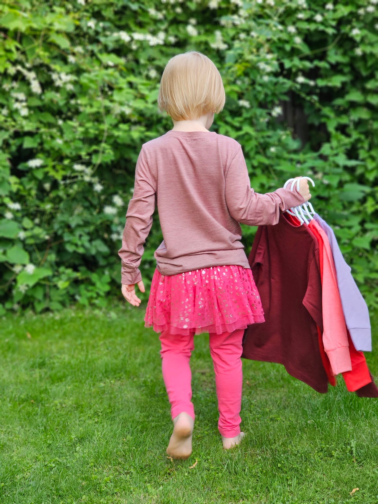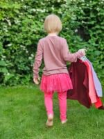 Pelenų rožinės spalvos. Ilgomis rankovėmis, kad būtų šilta, bet lengva – puikiai tinka visiems metų laikams.