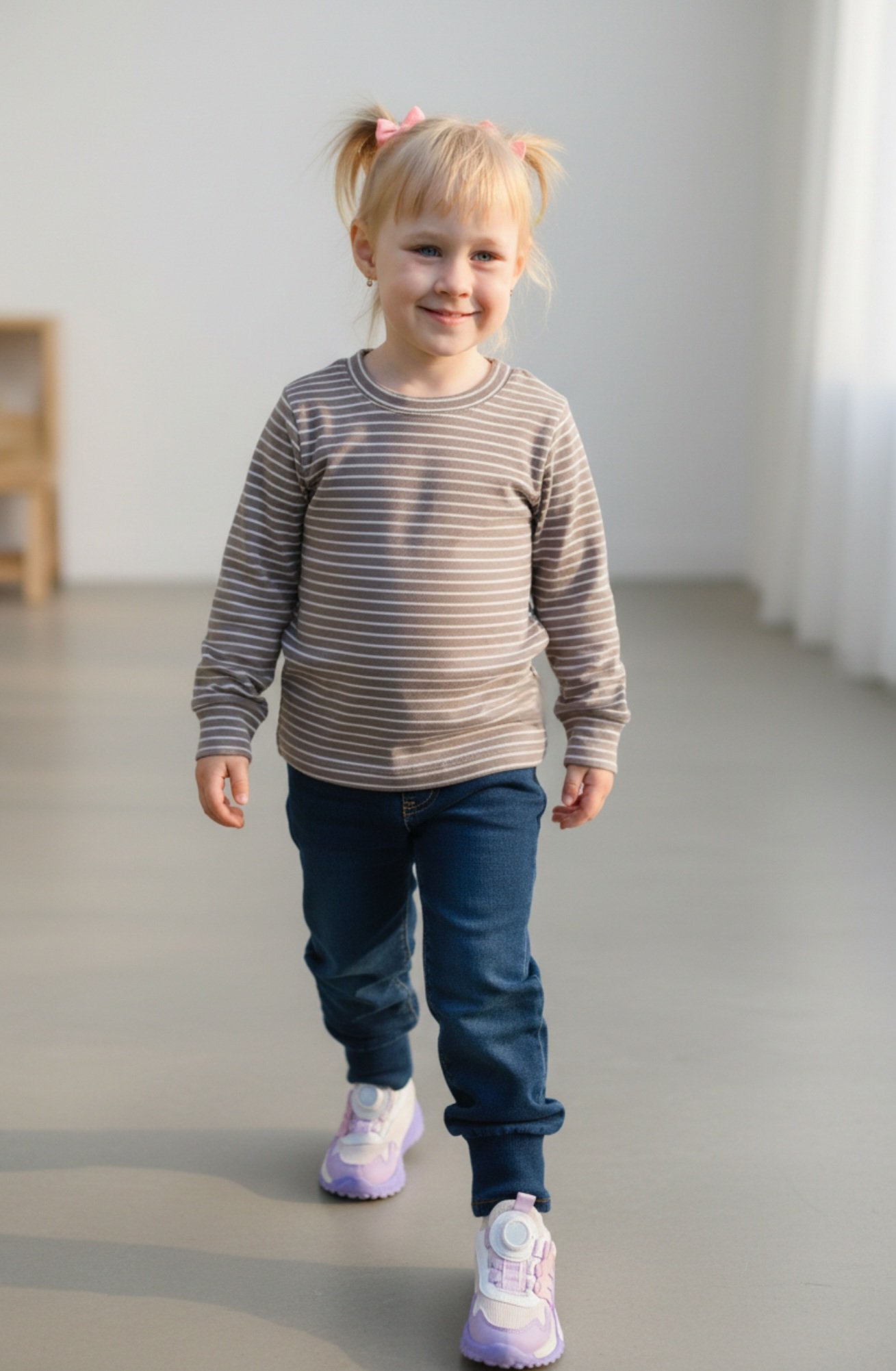 Dryžuota, kakavos ir baltos spalvos. Ilgomis rankovėmis, kad būtų šilta, bet lengva – puikiai tinka visiems metų laikams.