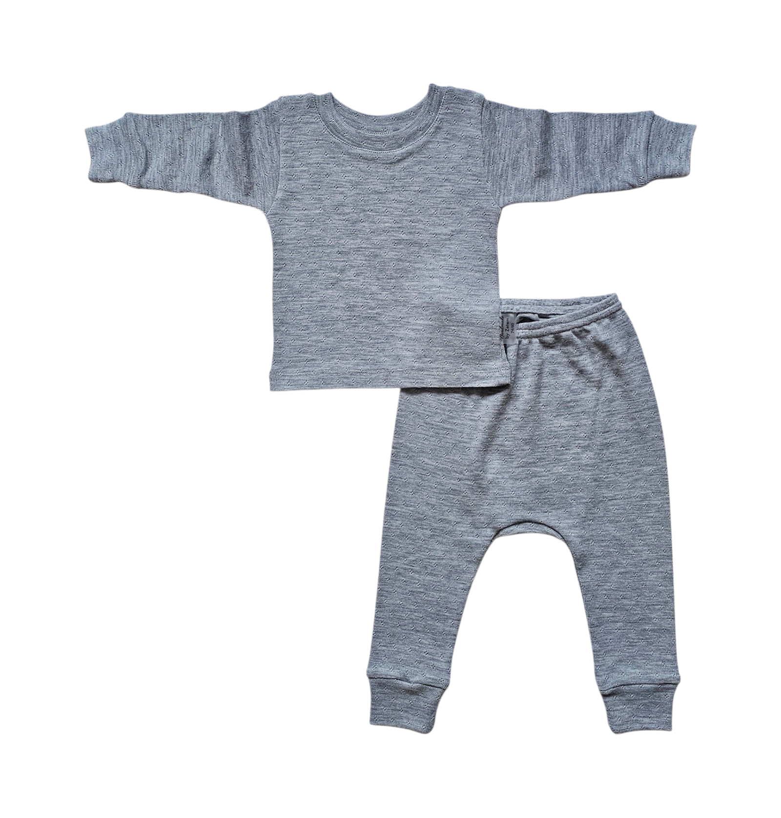 Universalus, praktiškas ir labai patogus komplektukas mažyliui. Tai minkštas ir švelnus 100%, vidutinio storumo 170g/m. merino vilnos trikotažas.